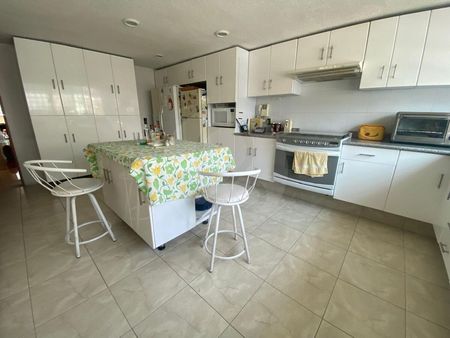 Cocina integral con isla y espacio para antecomedor, las puertas de la alacena tienen acabado de laca de alto brillo.