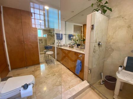 Recamara principal con walking closet de madera y baño con doble regadera y doble lavabo.