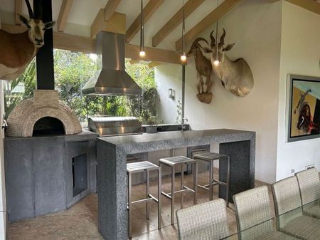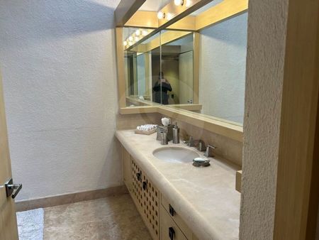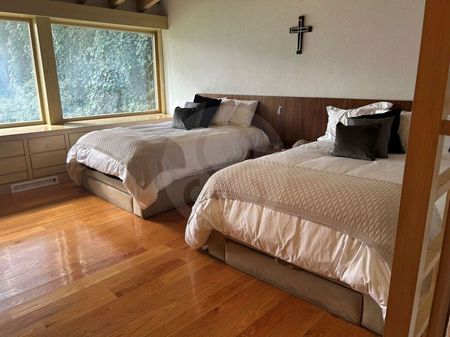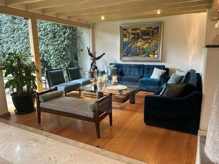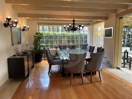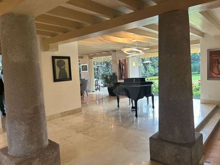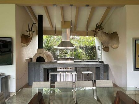 Espectacular residencia en Rancho San Francisco Esta hermosa propiedad cuenta con cuatro recámaras, dos con vestidor y dos con grandes closets, dos salas de TV, una en cada piso, bar con refrigerador de vinos, cocina italiana Piacere, garaje para seis autos, cuarto de servicio y cuarto de choferes. Al final del hermoso jardín nos encontramos con una hermosa construcción donde se puede disfrutar de un salón de juegos con horno de pizzas y asador de gas. Excelente propiedad! Y.N. El precio no incluye el impuesto que genera la compraventa así como los gastos notariales y avalúos.