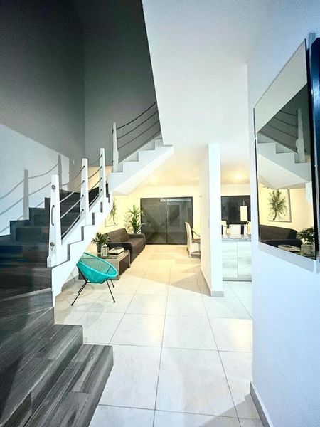 La propiedad en renta se encuentra ubicada en el Fraccionamiento Azul Pacifico , en la ciudad de Mazatlán, Sinaloa, México. Con una superficie total de 200 metros cuadrados, esta casa de dos plantas cuenta con tres recamaras, tres baños completos y un medio baño. Entre sus comodidades destacan una alberca, sala, cocina integral, cuarto de lavado, terraza, vestidor, dos plazas de aparcamiento, aire acondicionado, techos altos y seguridad digital. Además, se encuentra amueblada y con excelente acceso a servicios como wifi, agua caliente individual y closets. Su diseño luminoso y de lujo hacen de esta propiedad una excelente opción para quienes buscan comodidad y funcionalidad en un entorno tranquilo y seguro.