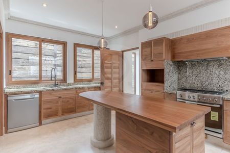 La cocina es cerrada y equipada con amplia alacena y barra de granito especial, todos los muebles de la cocina son de madera maciza y a un lado de la cocina tienes el área de servicio muy amplia y funcional con su cuarto de lavado y de servicio con baño completo.