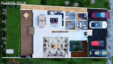 Planta Baja, sala comedor con acceso a deck y jardín de 100 m2, cocina integral completamente equipada con isla desayunador, despensa, cuarto de lavado, medio baño de visitas y cuarto de servicio con baño completo.