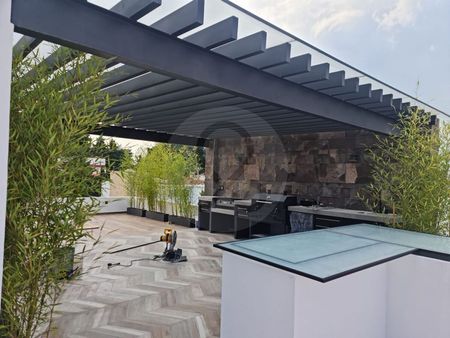 En el tercer nivel la casa cuenta con cuarto y baño de servicio y un roof garden equipado con asador y hornillas de gas, techado de 33 metros cuadrados.