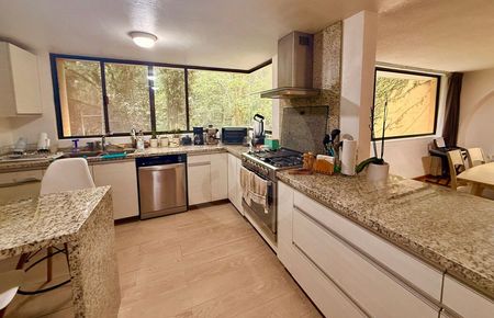 Casa remodelada dentro del fraccionamiento La Presilla desarrollada en desniveles. En planta baja hay un departamento independiente con sala/comedor, una recámara, cocineta, baño completo y salida al jardín. El jardín tiene asador y casita en el árbol. La casa cuenta con un salón de juegos a la entrada. En primer nivel amplia sala comedor, cocina abierta con desayunador, alacena, estudio, baño de visitas, área de lavado, cuarto servicio En planta alta 3 recámaras, recámara principal con baño y vestidor, las otras dos recámaras con vestidor cada una comparten baño. 3 lugares de estacionamiento. El fraccionamiento cuenta con un entorno arbolado y tranquilo. Estricta seguridad 24 horas. Fácil acceso a Luis Cabrera, Santa Fé, Periférico