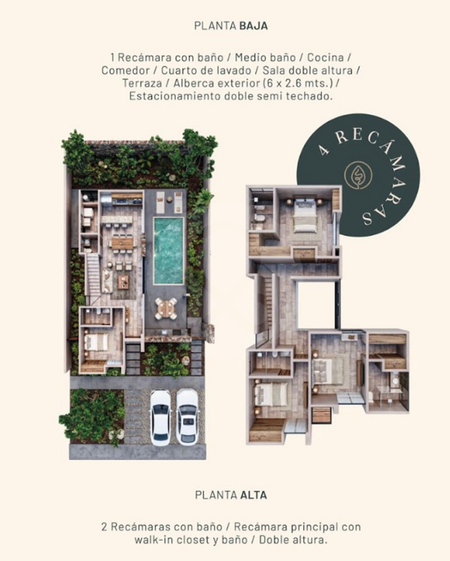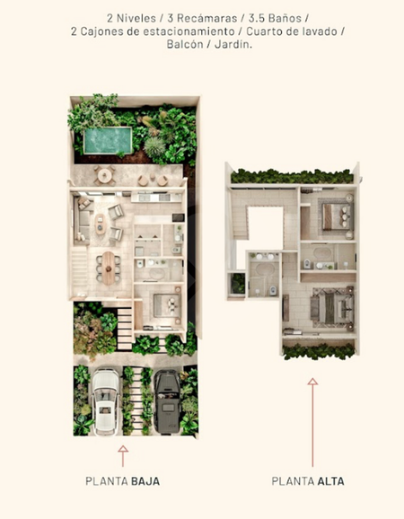 Las casas se desarrollan en dos niveles y cuentan con sala, comedor, cocina, jardín, 3 recamaras, 3 y medio baños, cuarto de servicios y dos cajones de estacionamiento. Algunas unidades cuentan con alberca en el jardín.