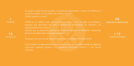 CH560 es un edificio único de arquitectura limpia y con un juego de fachada y espacios que aprovecha las vistas al Bosque de Chapultepec, los volcanes y de prácticamente toda ciudad. Además, por su ubicación céntrica se facilita el traslado en diferentes transportes, desde la bicicleta hasta el transporte publico.