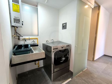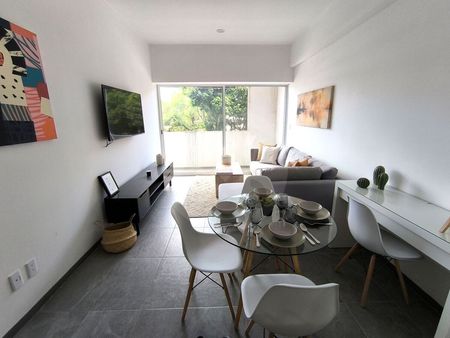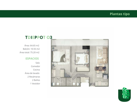 Con una superficie total de 88.77 m², este departamento cuenta con 2 habitaciones, 2 baños, cocina integral, sala de Tv, cuarto de lavado y balcón. Cuenta con un cajón de estacionamiento solo, no comparte con nadie. Además, ofrece amenidades como gimnasio, juegos infantiles, asador y salón de eventos.