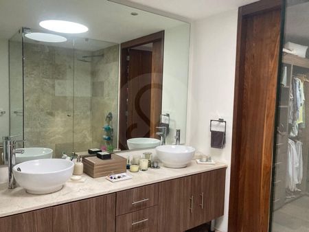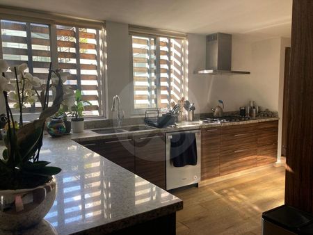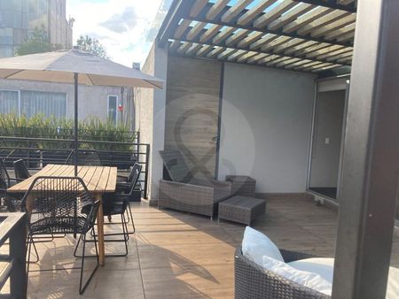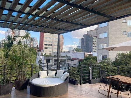 PH con terraza en renta en Newton. El departamento se renta con electrodomesticos. Son 210 m2 más 40 m2 de terraza privada. distribuidos en 3 niveles. PB: 2 recamaras que comparten bano y vestidor. Planta 1: estancia con cocina abierta, bano de visitas. Planta Alta: recamara principal con vestidor y bano muy amplio. Sale a una terraza semi techada privada de 42 m2 con preciosa vista arbolada. Tiene lavanderia y cuarto de servicio integrado y 2 lugares de estacionamiento. Vigilancia y camaras de seguridad 24 hrs. Unicamente 10 deptos en el edificio. Renta: $95,000 pesos mtto. Se aceptan mascotas con mes y medio de depósito. KF.