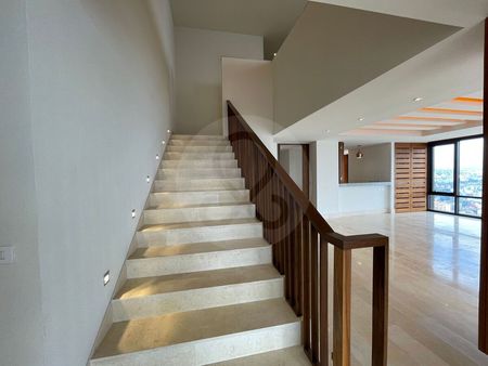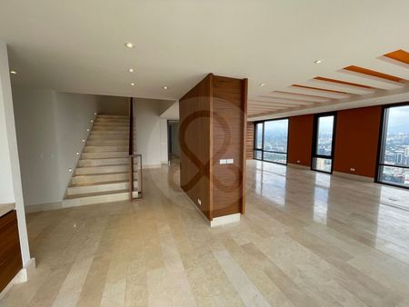 El Penthouse está distribuido en 2 niveles; en planta baja una súper amplia estancia, sala y comedor con terraza equipada con calentadores, cocina abierta con una gran alacena, oficina, varias bodegas, medio baño de visitas, area de lavado y de servicio; en planta alta 4 recámaras, la principal con baño y walking closet, otra secundaria con baño y vestidor y la tercera y cuarta con baño compartido, ideal para hermanitos y sala de TV.
