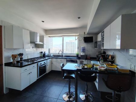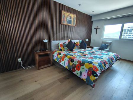 El departamento esta totalmente remodelado. Cuenta con sala, comedor, family, 3 reacamaras con vestidor y bano, desayunador, cocina integral con barra y amplia alacena, cuarto de servicio, cuarto de lavado y bodega. Elevador directo al departamento.