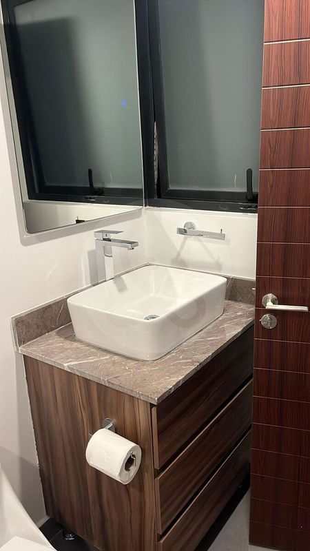 Los acabados incluyen porcelanato, laminado y una cocina abierta con cubierta de granito, pensada para quienes disfrutan de espacios modernos y funcionales. La fachada del edificio es reciente y está en excelente estado.