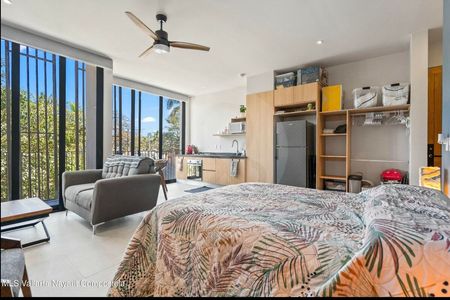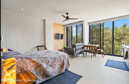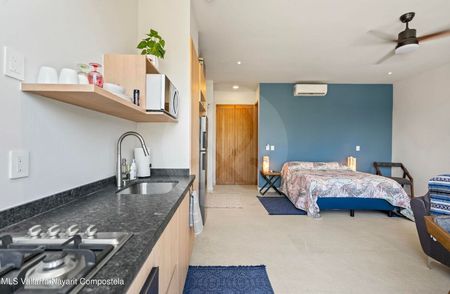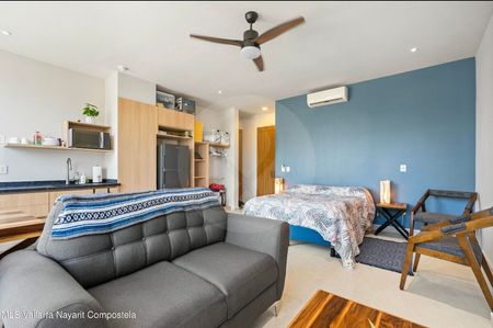Este estudio en venta se encuentra ubicado en Bucerías Centro, en una excelente ubicación cerca de la playa. Con una superficie total de 44.41 m2, este estudio ofrece una recámara, un baño y un diseño moderno de concepto abierto que combina la zona de dormitorio con la sala de estar de manera funcional. El espacio está amueblado con una decoración contemporánea que incluye una cómoda cama, un sofá y una pequeña mesa de comedor, lo que maximiza la funcionalidad sin perder estilo. Además, cuenta con una superficie techada de 44 m2 y se encuentra en excelentes condiciones. Ideal para aquellos que buscan un lugar cómodo y con estilo en Bahía de Banderas.