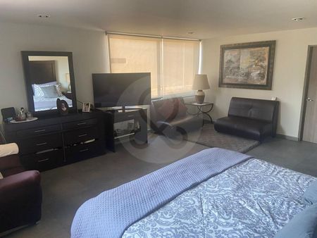 Planta alta: recámara secundaria con vestidor y baño, otra con clóset y baño compartido con sala de TV