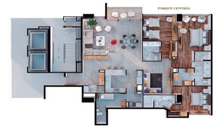El departamento cuenta con tres amplias recámaras, cada una con su baño privado. La recámara principal incluye un vestidor y un baño doble, brindando un espacio de lujo para el descanso y la relajación. Además, hay un medio baño de visitas para mayor comodidad.