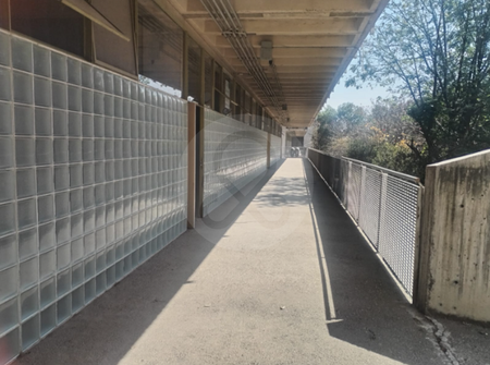 Pasillos con barandal metálico en ambos niveles superiores