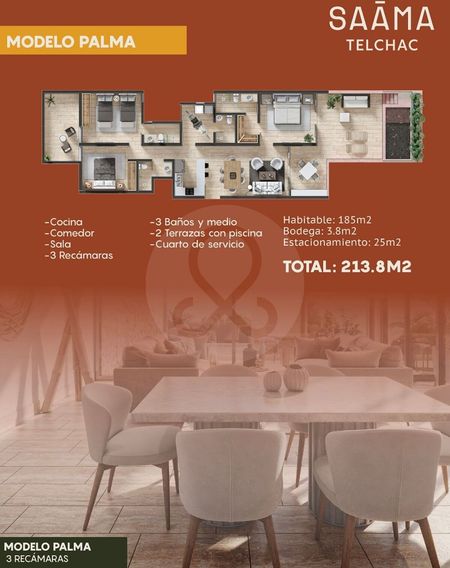 Descubre Saama Telchac, un exclusivo desarrollo vertical en las hermosas playas de Yucatán. Diseñado para quienes valoran la privacidad, el lujo y la tranquilidad, Saama ofrece un entorno de baja densidad con un número limitado de unidades, ideal para disfrutar de una vida extraordinaria en un paraíso frente al mar. En el desarrollo Saama Telchac en Telchac Puerto, Yucatán, se encuentra esta propiedad en venta. El modelo Palma cuenta con una superficie total de 213.8 metros cuadrados, esta departamento cuenta con 3 recamaras, 3 baños completos y un medio baño y 2 lugares de estacionamiento (25m2). Ademas de sus increibles 2 terrazas y su piscina. Entre sus servicios destacan el acceso a la playa, aire acondicionado, alberca, asador, gimnasio, bodega, terraza, sala de juegos, cuarto de lavado y cochera fija descubierta. La propiedad se encuentra en excelente estado y fue construida recientemente. Saama Telchac es el lugar perfecto, ya sea para vivir o disfrutar de unas vacaciones inolvidables. Situado en una de las playas más exclusivas y seguras de la costa yucateca, este desarrollo te permite experimentar diariamente la serenidad y los privilegios de estar a pasos del mar. Ubicada en una zona tranquila y segura, esta casa es ideal para quienes buscan comodidad y estilo en Telchac Puerto. ¡No pierdas la oportunidad de adquirir esta propiedad!