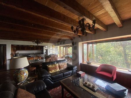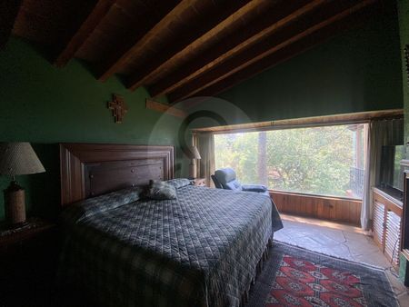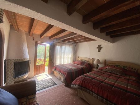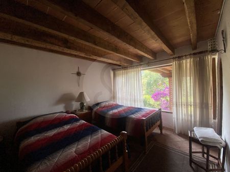 El terreno en pendiente brinda una vista privilegiada, y su estilo Vallesano Clásico le da un toque cálido y auténtico. La casa cuenta con 4 recámaras, cada una con baño propio, amplia sala, comedor, terraza con vista espectacular, jardín rodeado de encinos, cuarto de servicio con baño y cochera cubierta para 3 autos.