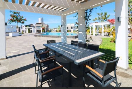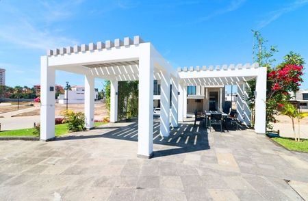 Las amenidades del fraccionamiento incluyen dos albercas, múltiples terrazas y pérgolas techadas, mobiliario de exteriores, asadores, baños públicos y áreas verdes.