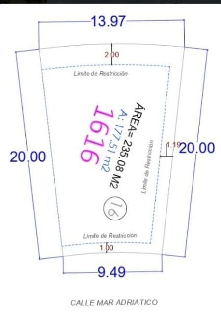 El lote #16 tiene una forma de “abanico”, con 9.49 metros lineales al frente, 20 metros lineales de fondo y casi 14 metros lineales en la parte del patio.