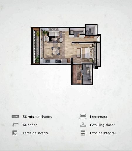 Unidades de 66mts, 1 recámara, 1.5 baños, 1 estacionamiento, desde $4'950,000 pesos.