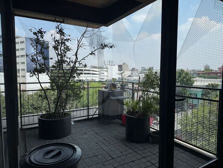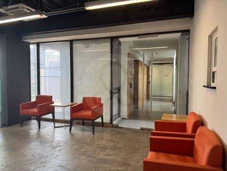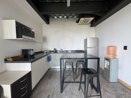 2 Terrazas que dan a insurgentes, 2 Privados, 1 Baño, 1 sala de juntas, área común de empleados, área para empleados cerrada, cocineta con refri, isla, barra