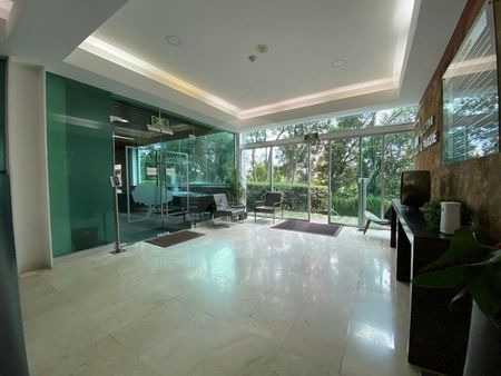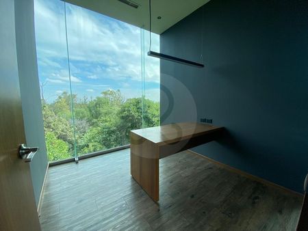 Esta propiedad cuenta con un diseño contemporanéo y completamente remodelado, se encuentra en el segundo piso, ventanales de cristal vista hacia jardines, ofreciendo una vista panorámica de la ciudad y áreas abiertas.