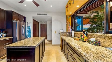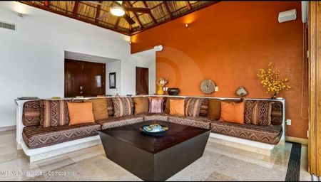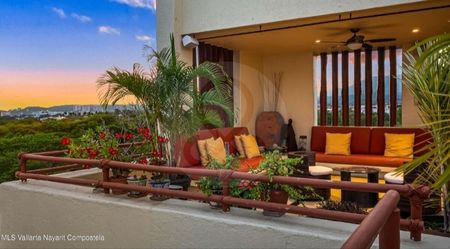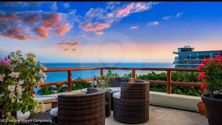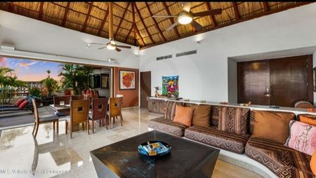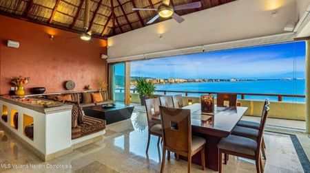 Descubre el lujo tropical en su penthouse frente la playa. Este hogar totalmente amueblado en el último piso combina la vida interior y exterior con impresionantes vistas de la Bahía y las montañas de la Sierra Madre.