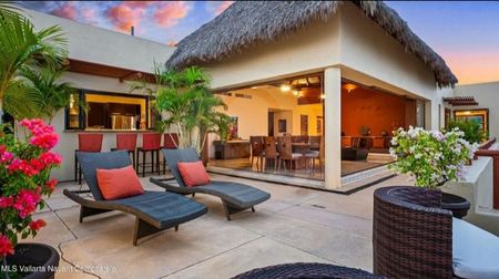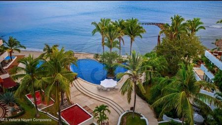 Amenidades: 8 albercas infinitas, club de playa, spa, gimnasio, tenis, senderos para caminar y seguridad 24/7. Cerca de Bucerías, La Cruz, y aeropuerto.