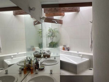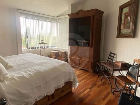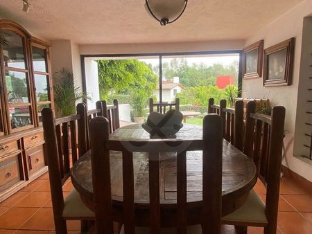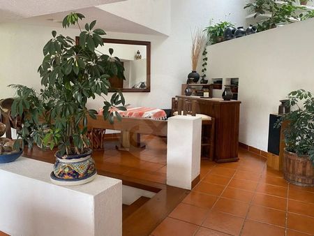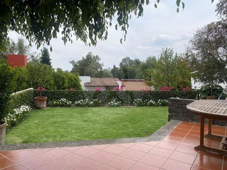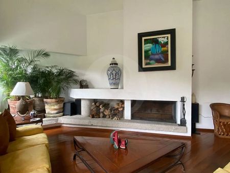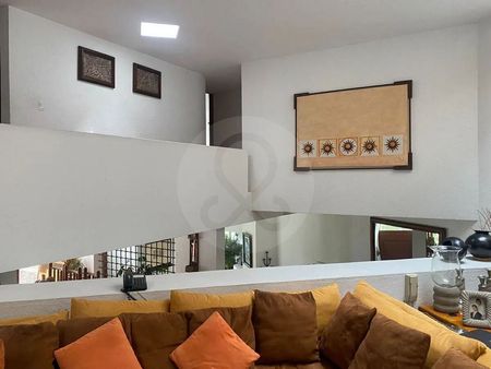 En el primer nivel sala, con chimenea y ventanales, medio nivel más arriba, comedor, cocina con espacio de antecomedor con vista a la terraza y al jardín, en el jardín hay un árbol, en el mismo nivel, un espacio de bar, medio nivel arriba, sala de TV , medio baño y una bodega; medio nivel más las 3 recámaras con baño, la principal con vestidor y jacuzzi, la casa cuenta con área de servicio con cuarto y baño.