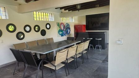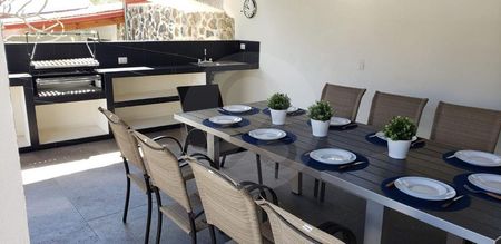 Área de asador con tarja, espacio para estufa, refrigerador, bar y comedor para hasta 12 personas